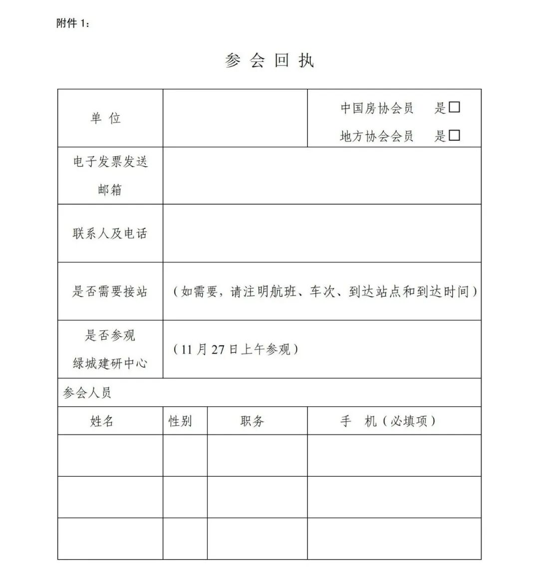 各地保障房建设管理部门、建设单位及设计、建造、物业等相关单位代表;房地产开发、代建、城市更新相关单位代表;房地产业协会(开发协会)、学会代表。(一)会务费:中国房协会员单位 1200 元/人(各省市房协会员享受中国房协会员优惠待遇),非会员 1800 元/人。食宿统一安排,住宿费自理。(二)报名方式:请于 11 月 20 日前报名,填写《参会回执》报名,发送至电子邮箱。会务费于 11 月 22 日前汇至中国房协账户。本次会议采用数电发票形式,会议结束后 5 个工作日内开具数电发票,并发送到邮箱,请在参会回执填写收票人邮箱。(三)住宿预订:住宿在安吉竹博园开元名都度假村,请参会人员提前预订房间,预定房间请报会议名称,酒店联系人:邵梦迪 15167217736。酒店地址:浙江省湖州市安吉县 201 省道中国竹子博览园接站站点:安吉高铁站、杭州火车东站、杭州火车西站、杭州萧山机场。需要接站的代表请在参会回执表中注明航班、车次、到达站点和到达时间。安吉高铁站:距离酒店 31 公里,乘车大约 40 分钟。杭州火车西站:距离酒店 62 公里,乘车大约 60 分钟。杭州东站:距离酒店 84 公里,乘车大约 80 分钟。杭州萧山机场:距酒店 116 公里,乘车大约 90 分钟。电话:010—58934672、17060958668、18310810071、15201251500地址:北京市海淀区三里河路 9 号住建部大院内标准图集 2楼 207(邮编:100835)E—mail:zhongfangxie888@163.com